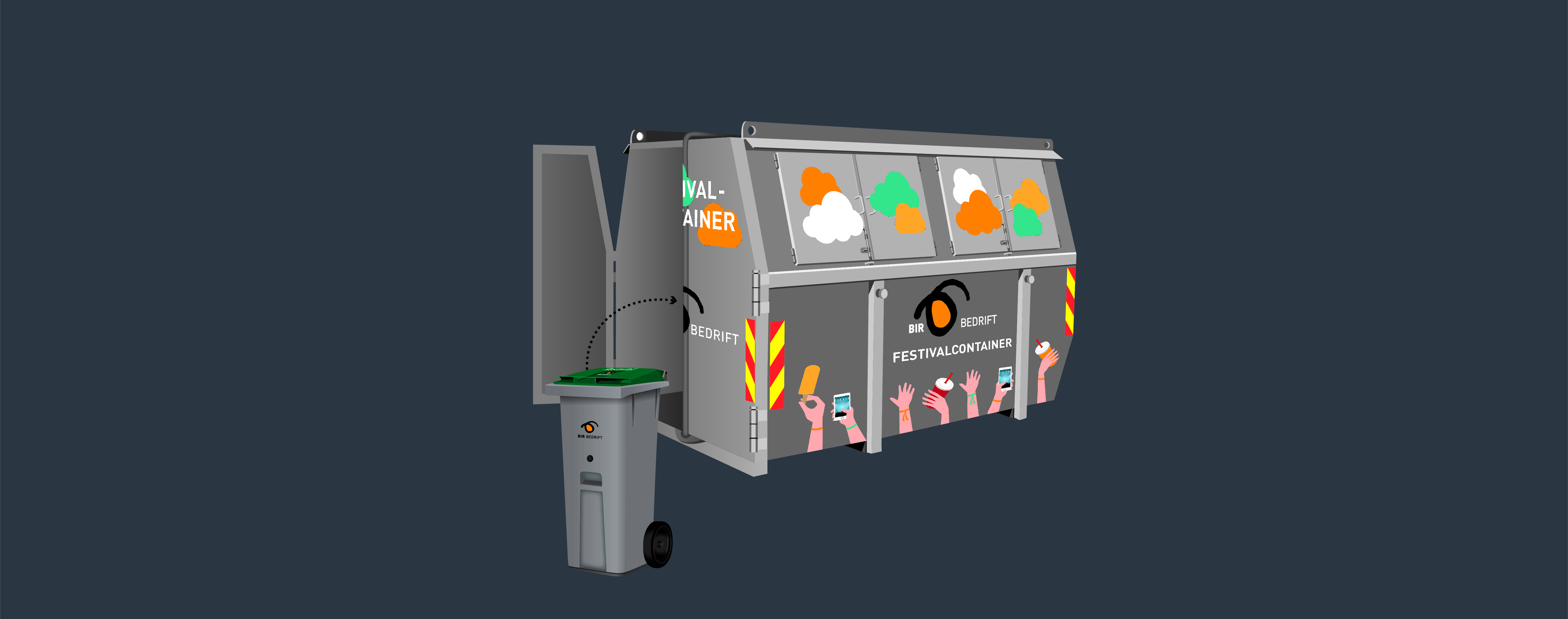 Containeren inneholder inntil 12 beholdere som trilles ut og fordeles på området. Når beholderne er fulle settes de tilbake i containeren og BIR Bedrift henter etter avtale.