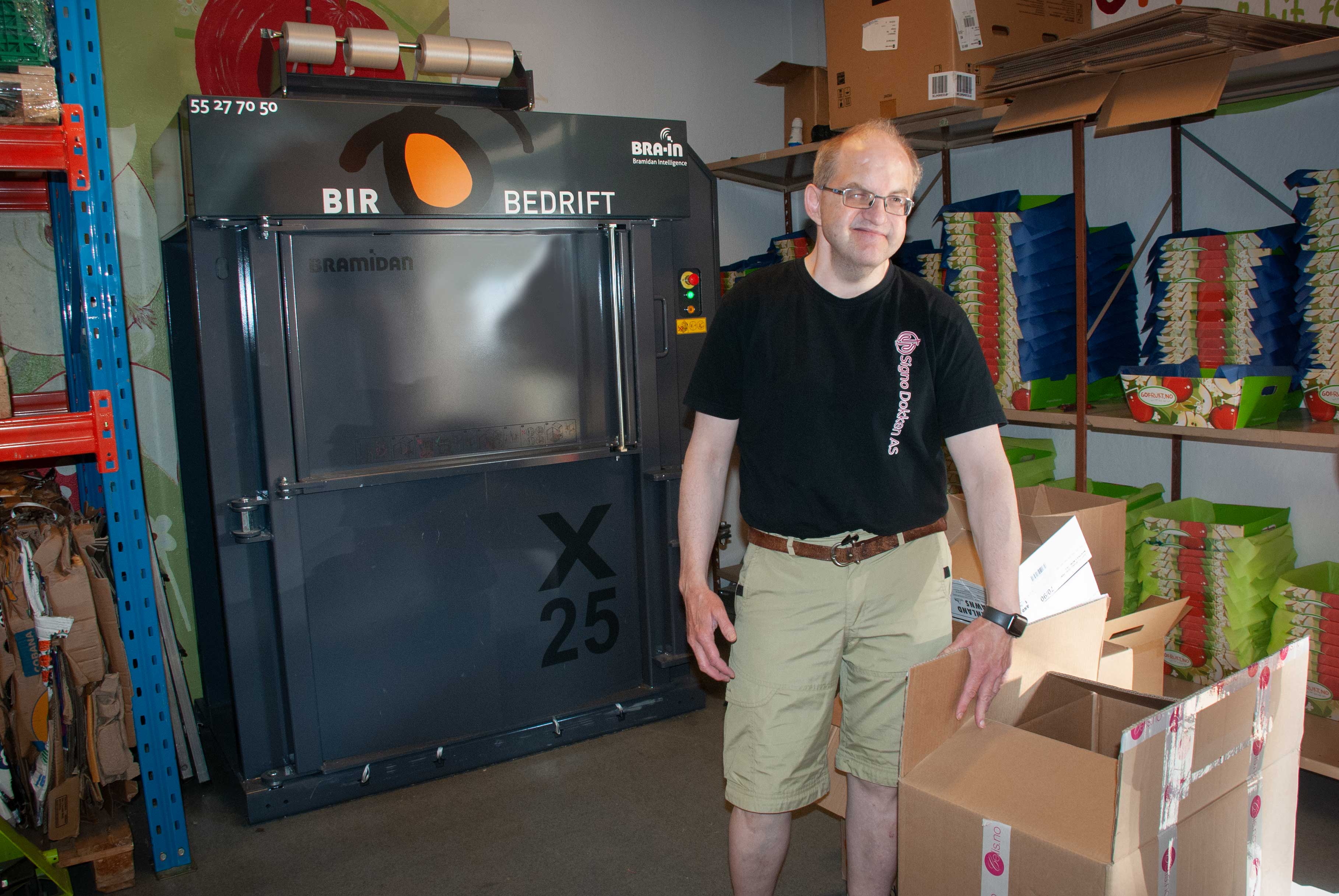 Signo Dokken AS er blant våre kunder som har mye pappemballasje. Arbeidsmarkedsbedriften gir arbeid til døve/hørselshemmede og døvblinde i bergensområdet. Blant arbeidsoppgavene er pakking av frukt til ulike bedrifter, noe som vil si at det blir mye pappemballasje å kvitte seg med.