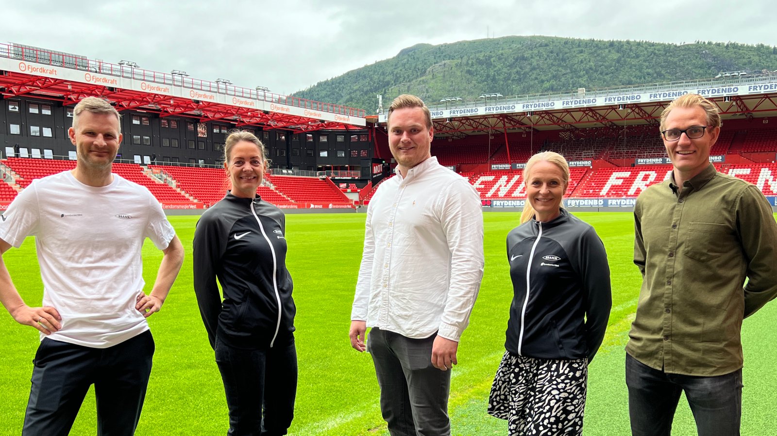 Miljøtiltak på Stadion. Fra venstre: Christian Kalvenes, daglig leder Brann, Kjersti Meyer-Moe, bærekraftsansvarlig Brann, Ruben Haveland, salgsleder BIR Bedrift, Therese Andvik Rygg, leder marked, kommunikasjon og bærekraft Brann, Jørgen Møklebust Austvik, markedsføringsansvarlig BIR Bedrift.