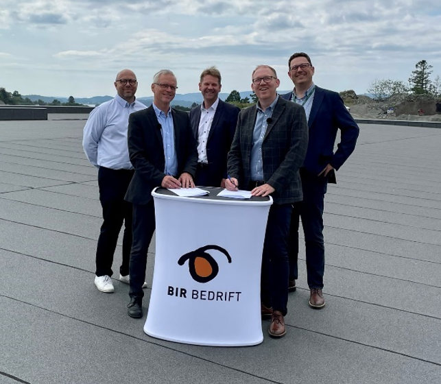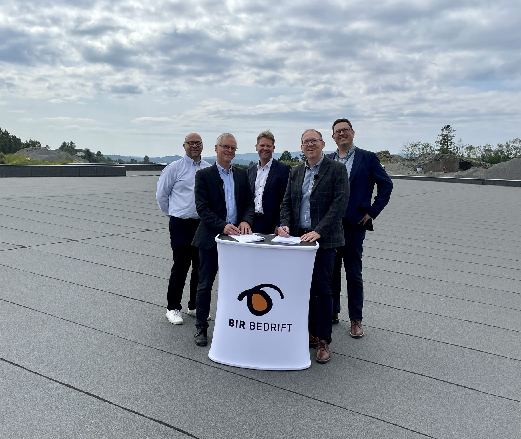 20. juni 2023 signerte BIR Bedrift og Eviny Termo avtalen og opprettet selskapet BIR Bedrift Energi AS. Fra venstre John Halfdan Mørner, Økonomisjef i BIR Bedrift og daglig leder i det nye selskapet, Øystein Haaland, daglig leder i Eviny Termo, Hans Tysnes, ass. banksjef i Nordea, Kjell Svellingen, Eviny og styreleder i det nye selskapet, og Anders Haugsvær-Holst, daglig leder i BIR Bedrift.