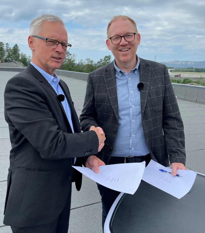 Øystein Haaland, daglig leder i Eviny Termo, og Anders Haugsvær-Holst, daglig leder i BIR Bedrift, har signert avtalen mellom BIR Bedrift og Eviny Termo.